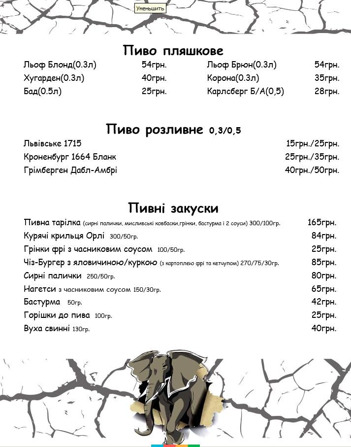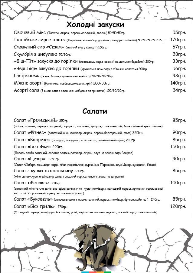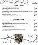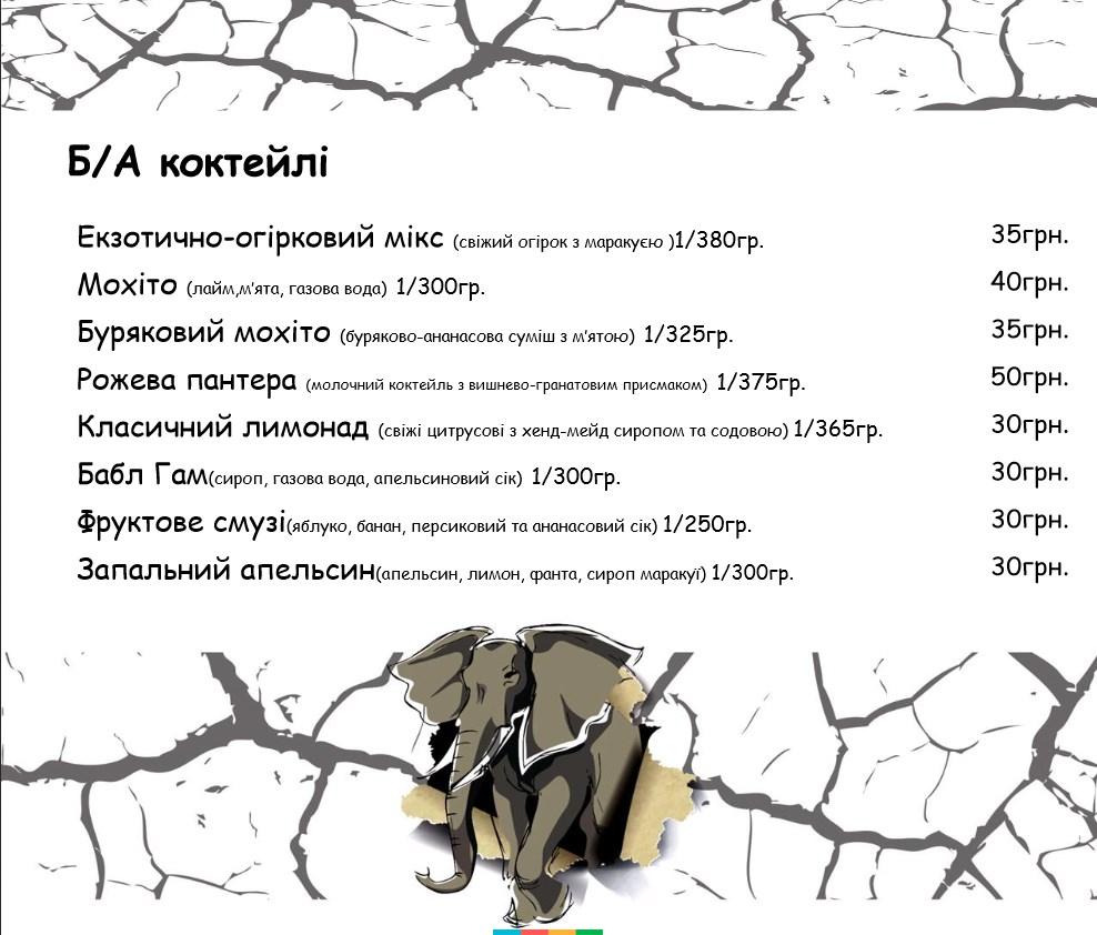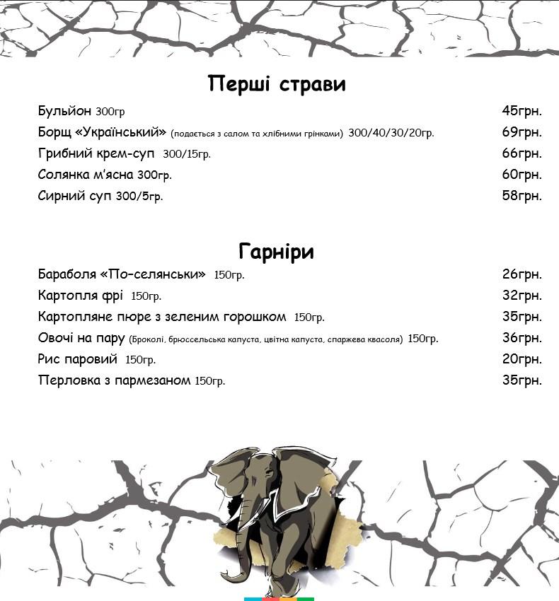 Заклад пригощає стравами європейської, американської та української кухні, є гриль-меню і страви на мангалі, обширна алкогольна карта, є безалкогольні напої і десерти.